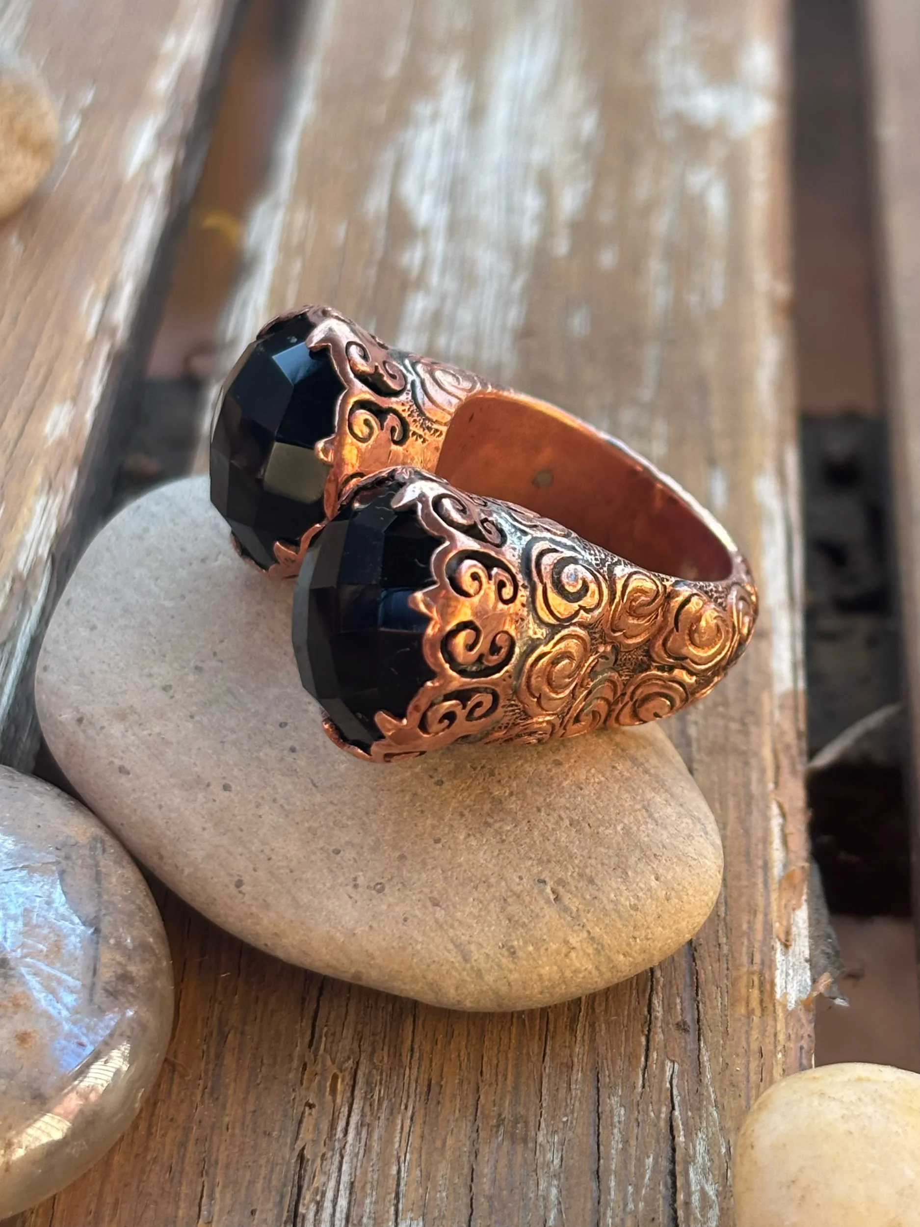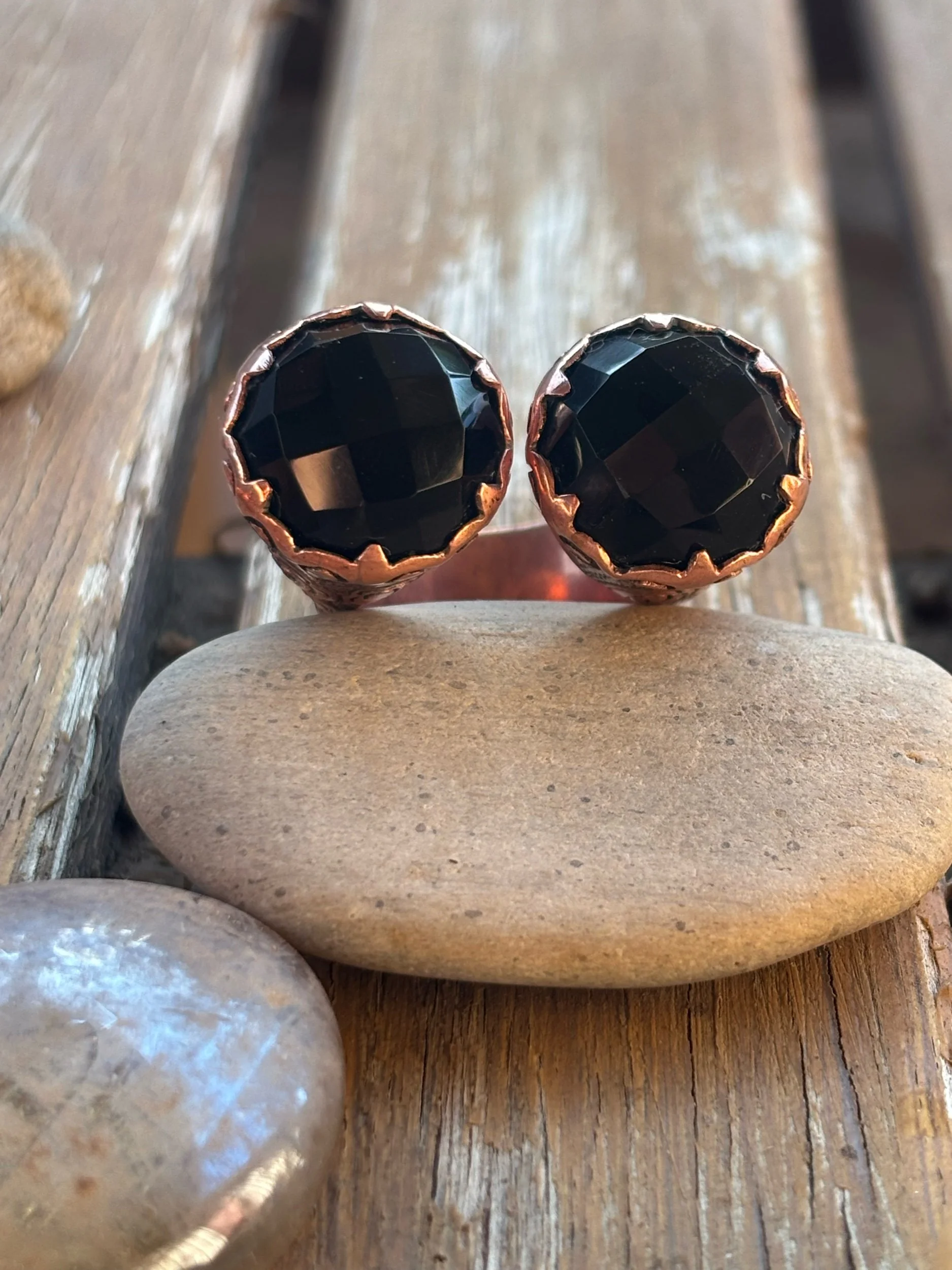 Shop › Black magic Size 8-9 Image 1 of 3 Image 2 of 3 Image 3 of 3 Black magic Size 8-9 $380.00 Beautiful cut of a black Onyx set in copper super classicSize 8 to 9 Quantity: Add To Cart Added! Beautiful cut of a black Onyx set in copper super classicSize 8 to 9