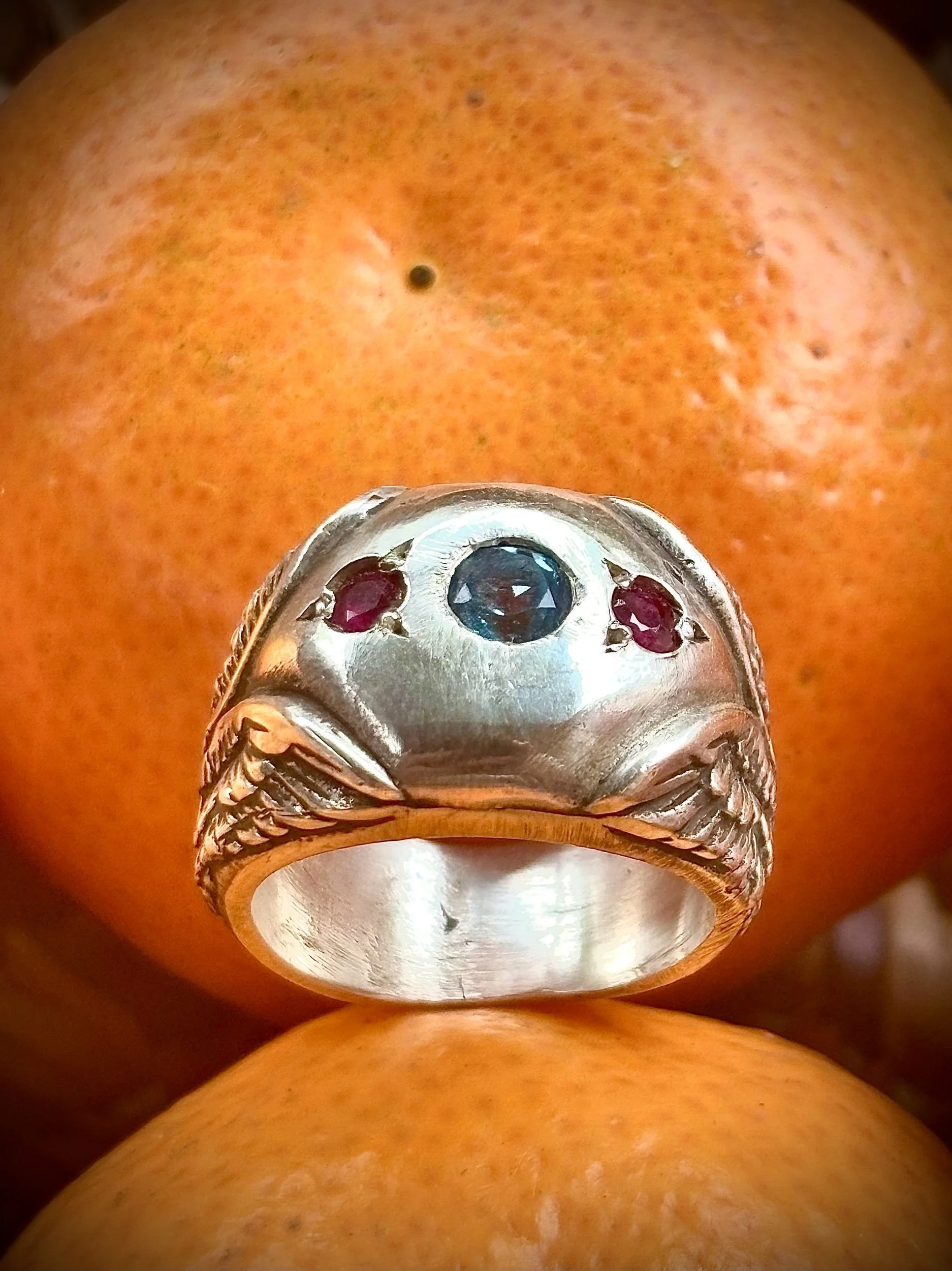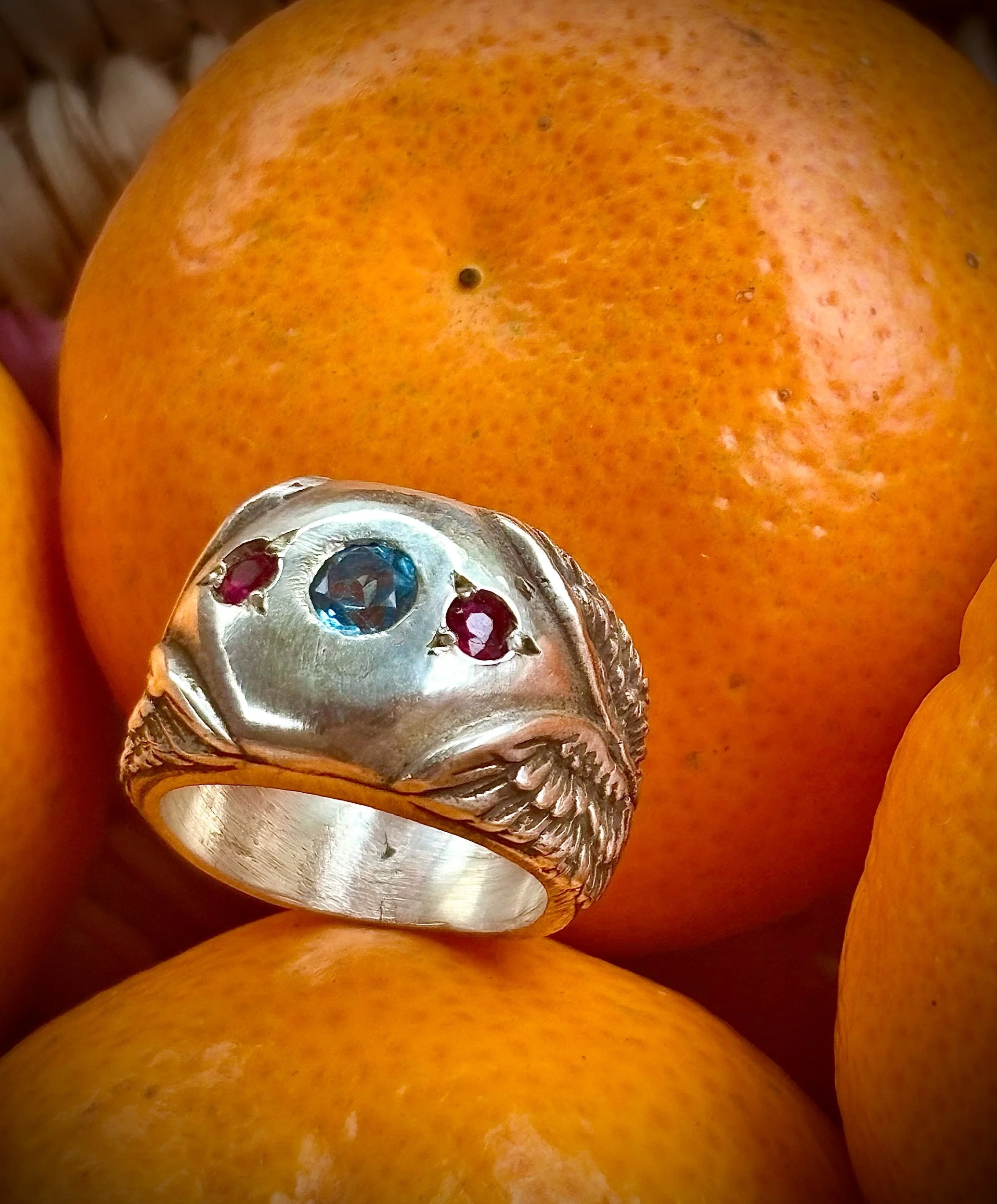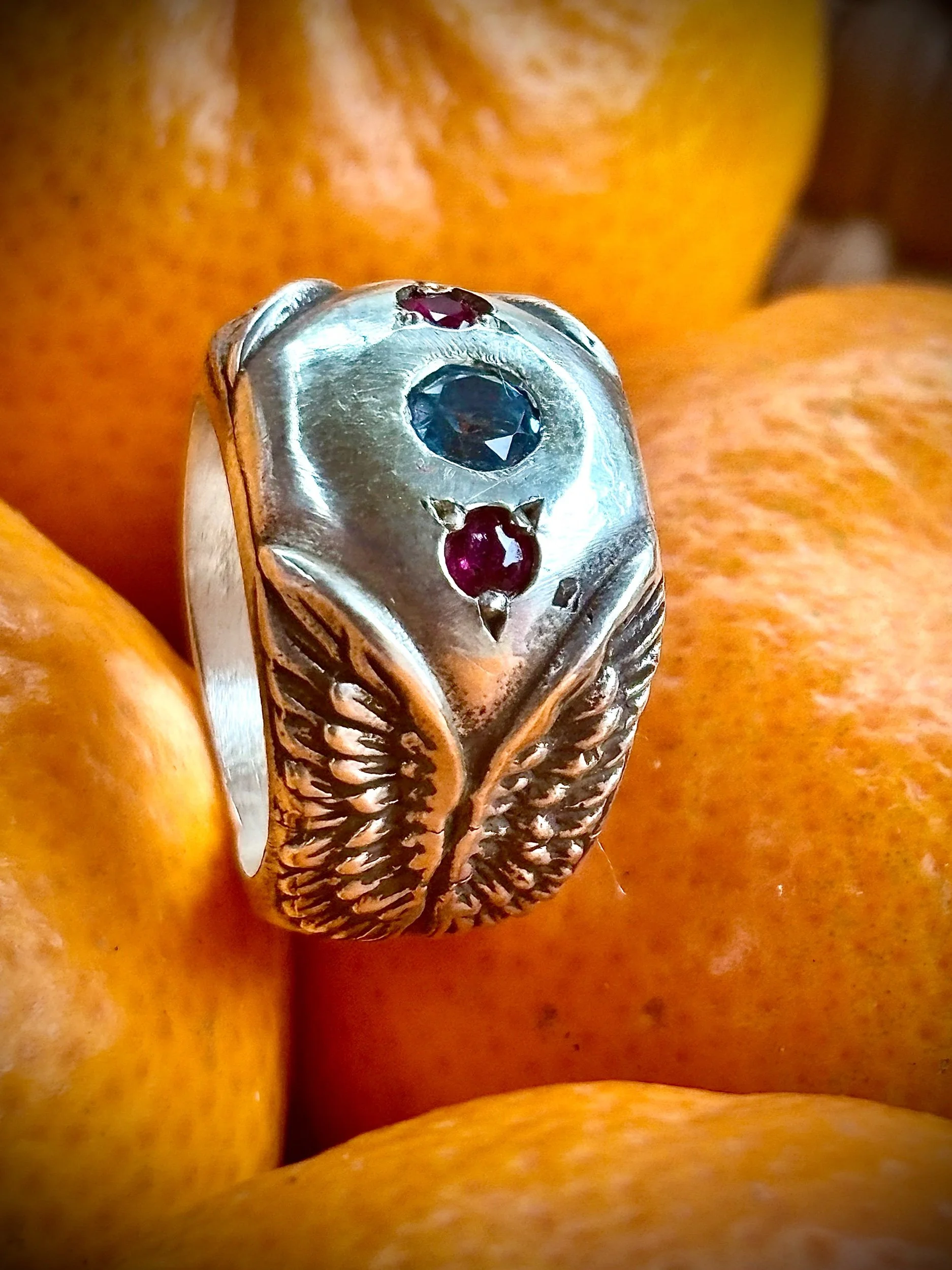 Shop › Blue Angel size 6 Image 1 of 3 Image 2 of 3 Image 3 of 3 Blue Angel size 6 $550.00 Beautiful angel wings ring set in Silver with blue topaz and rubiesMade with love and care Add To Cart Added! Beautiful angel wings ring set in Silver with blue topaz and rubiesMade with love and care