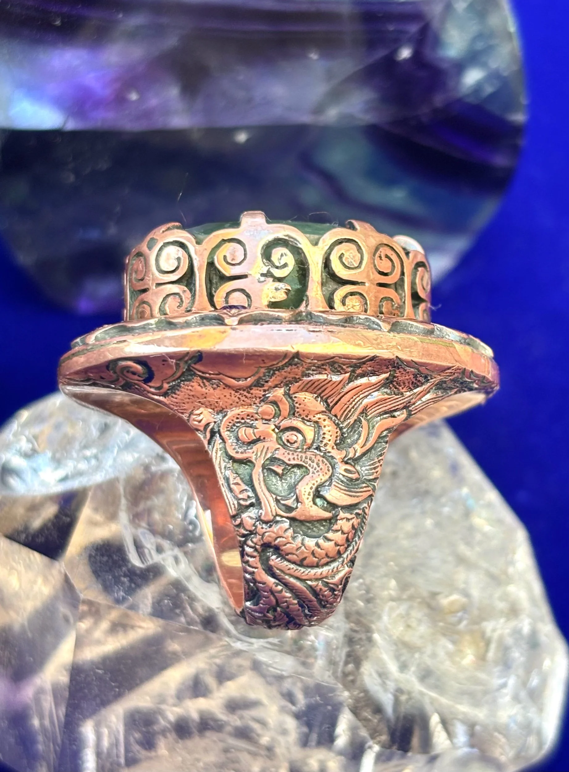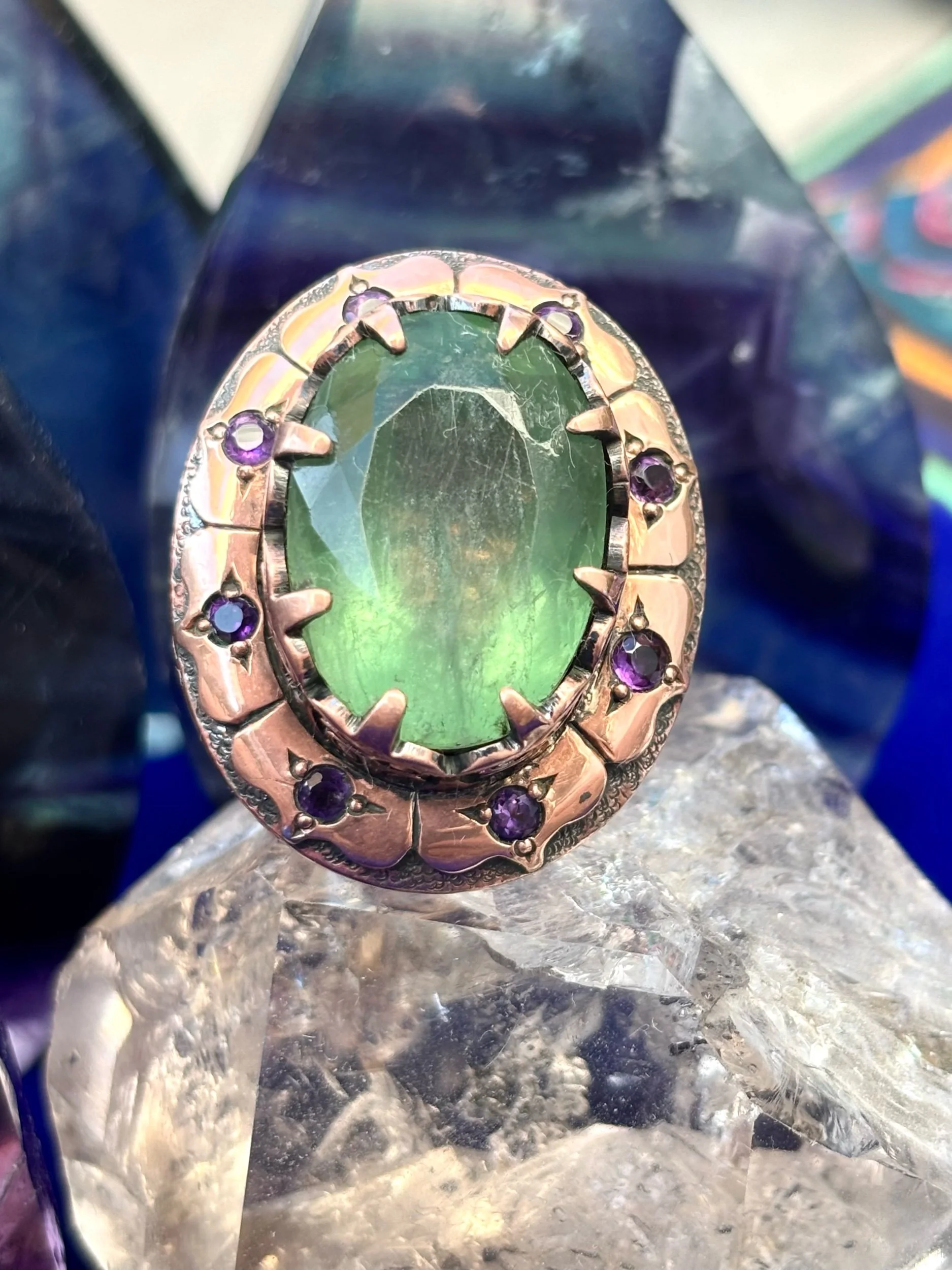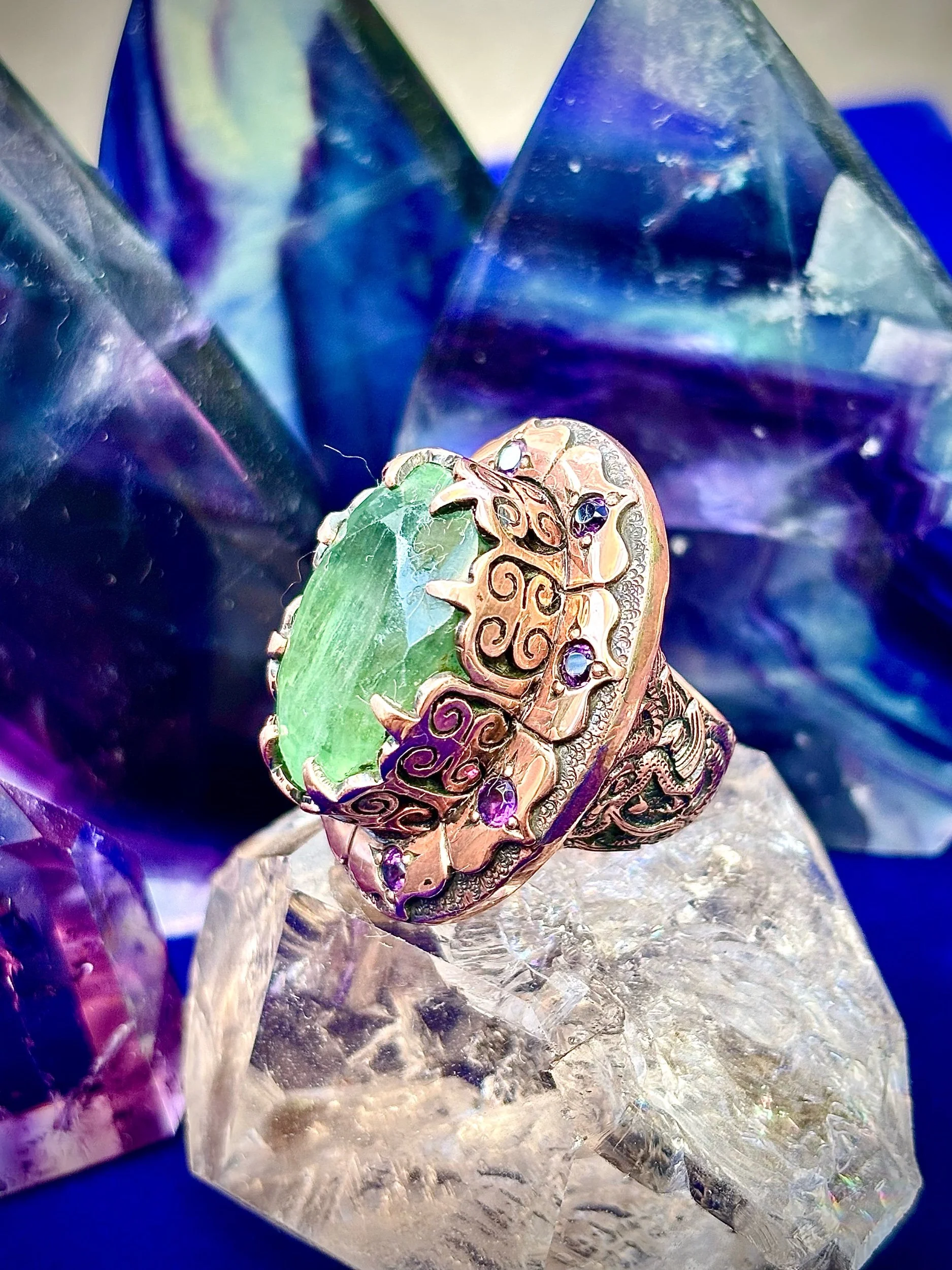 Shop › Green love size 7 Image 1 of 3 Image 2 of 3 Image 3 of 3 Green love size 7 $550.00 Incredible Fluorite Set in pure copper and so much details all handmade one of a kind Add To Cart Added! Incredible Fluorite Set in pure copper and so much details all handmade one of a kind