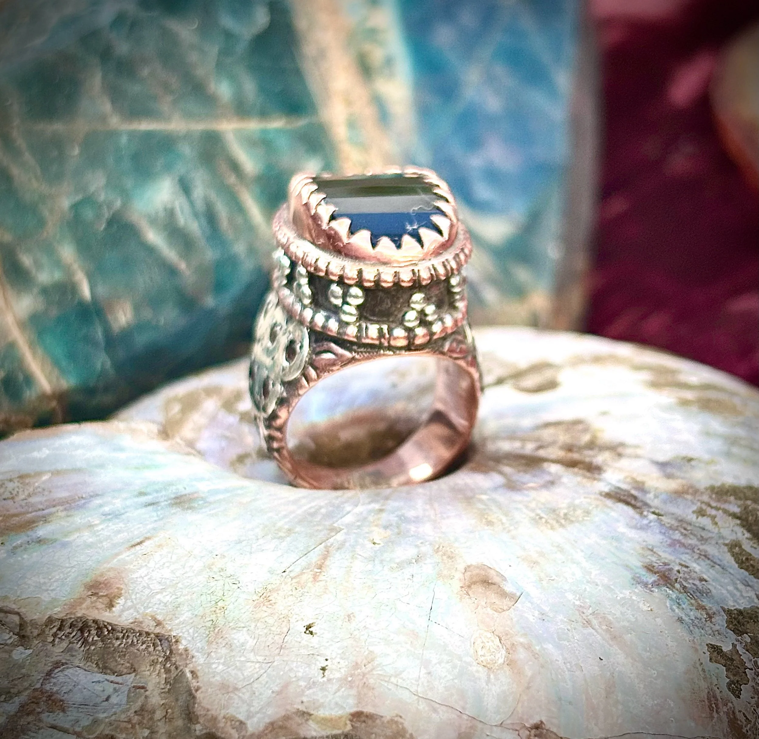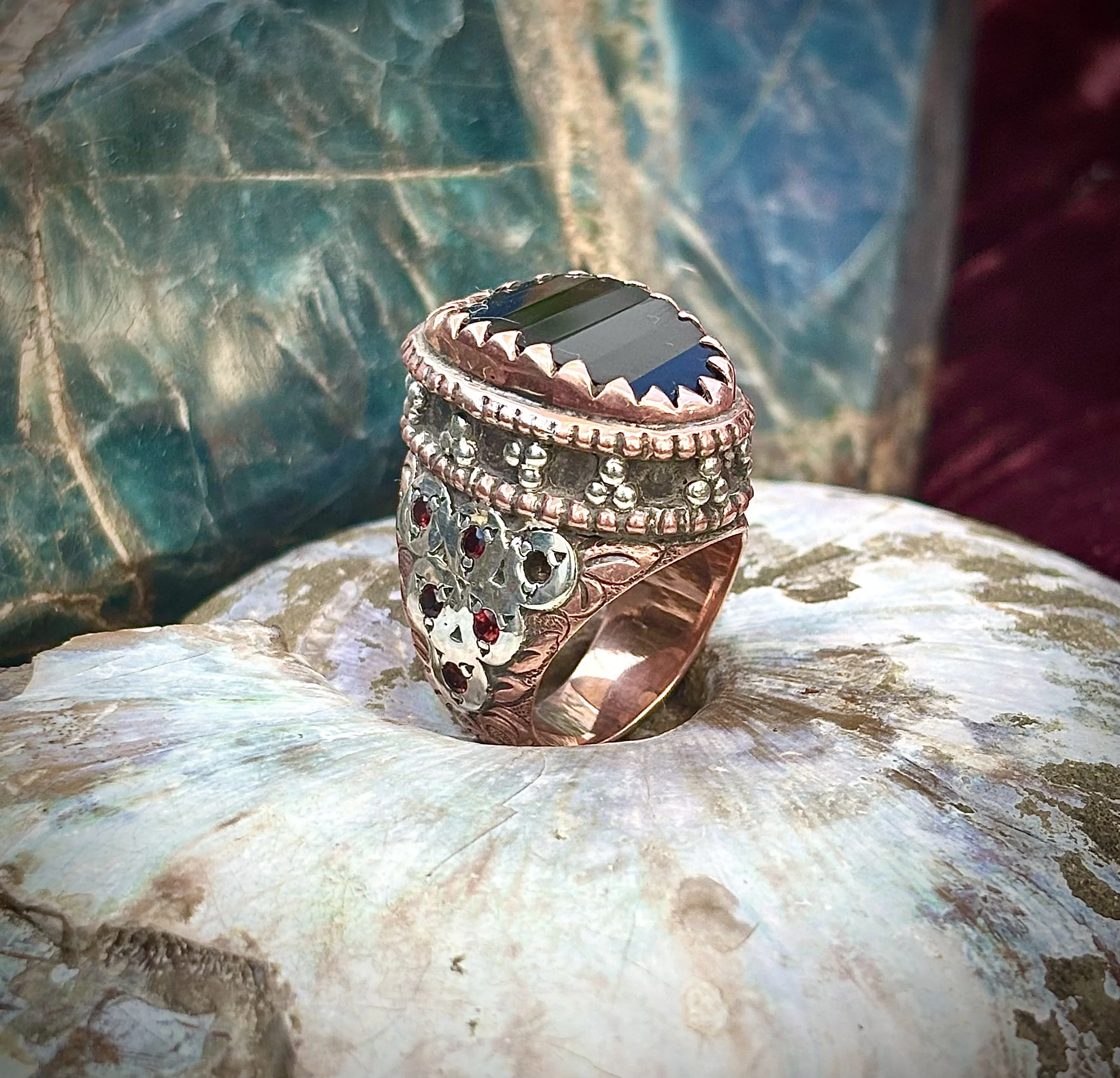 Smoky quartz and garnets made from pure copper and silver with love and care