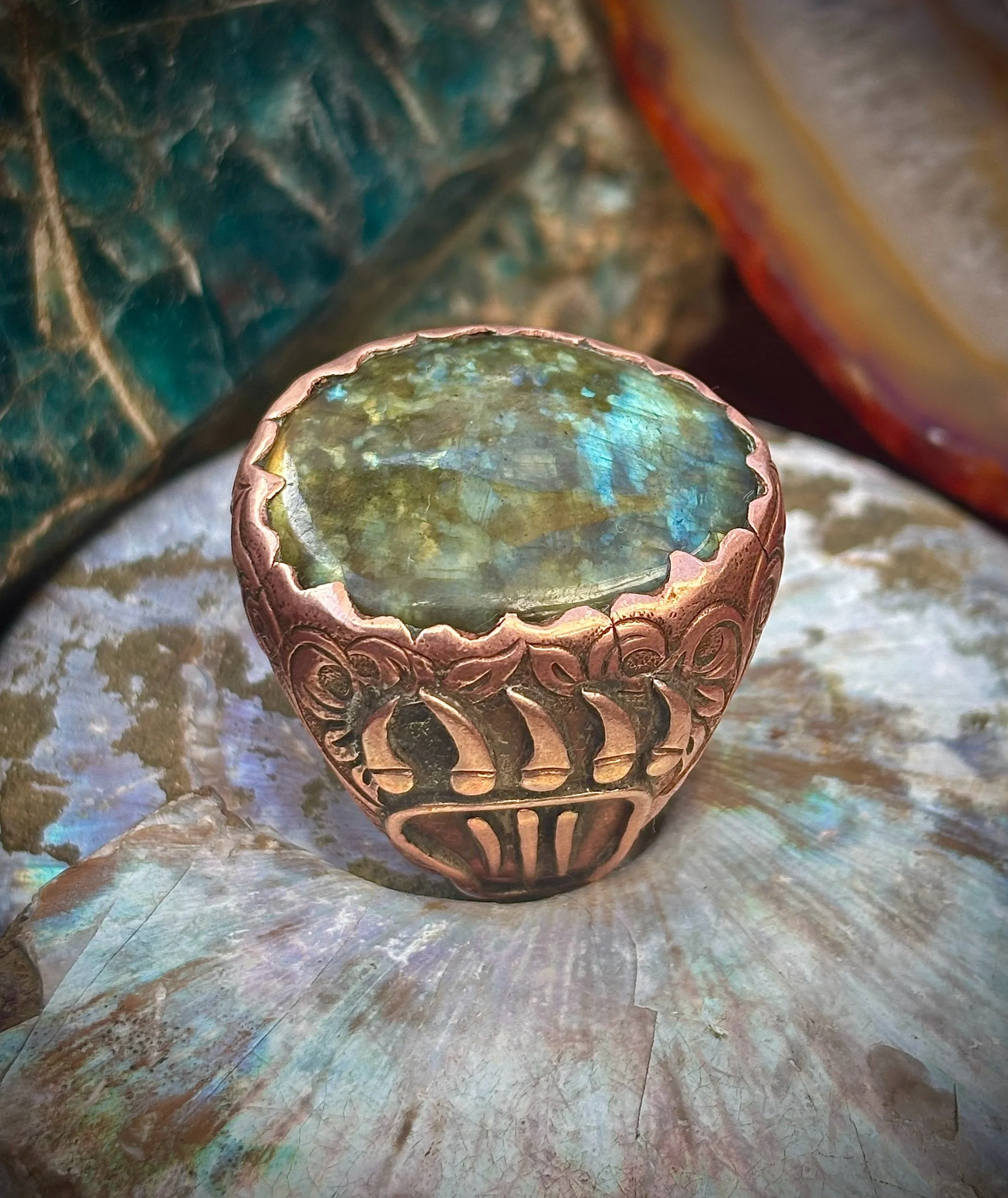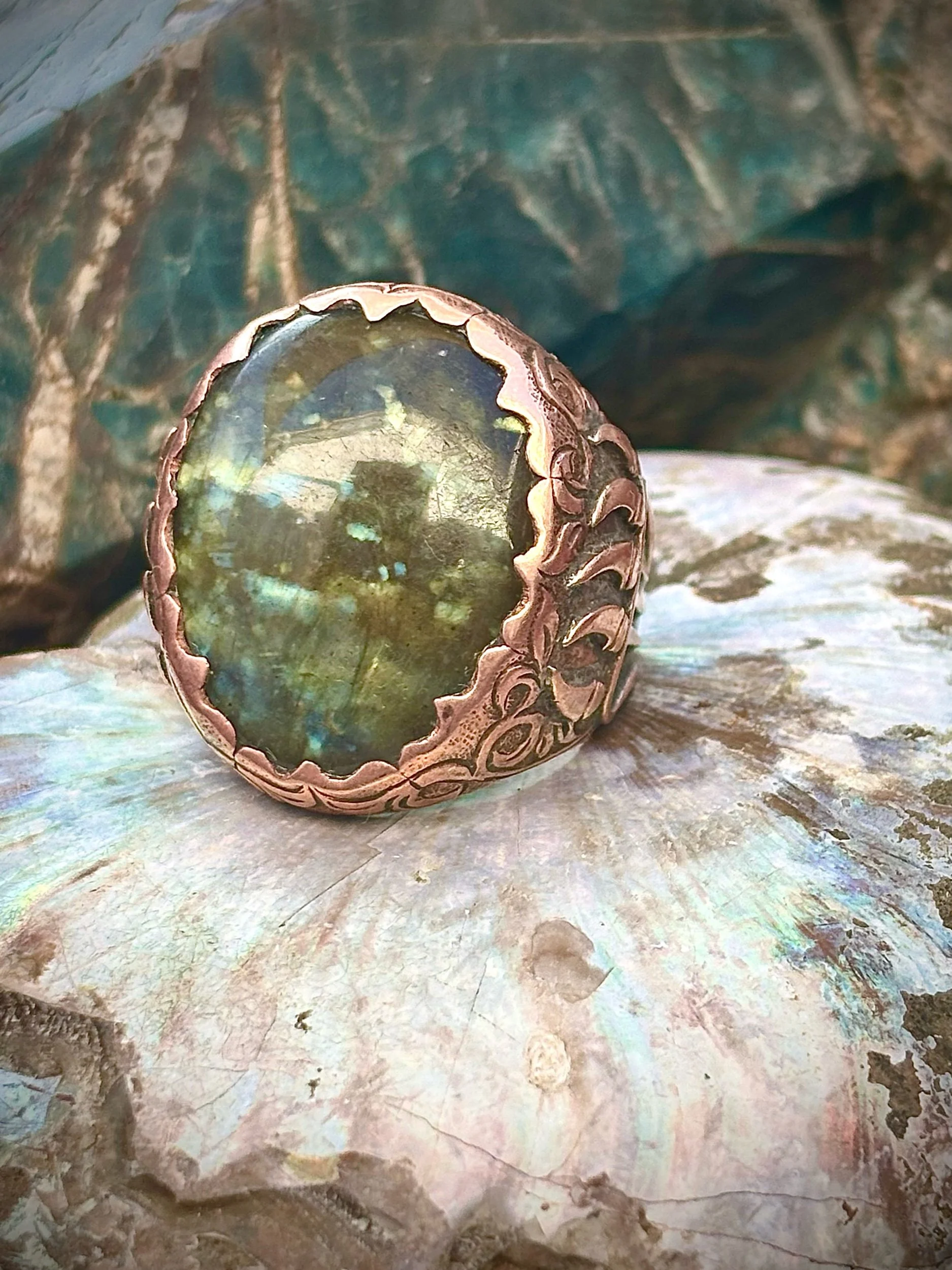 Shop › Madagascar lab 11.5 Image 1 of 3 Image 2 of 3 Image 3 of 3 Madagascar lab 11.5 $520.00 Pure copper labradorite ring Made with amazing love Size 11.5 Add To Cart Added! Pure copper labradorite ring Made with amazing love Size 11.5
