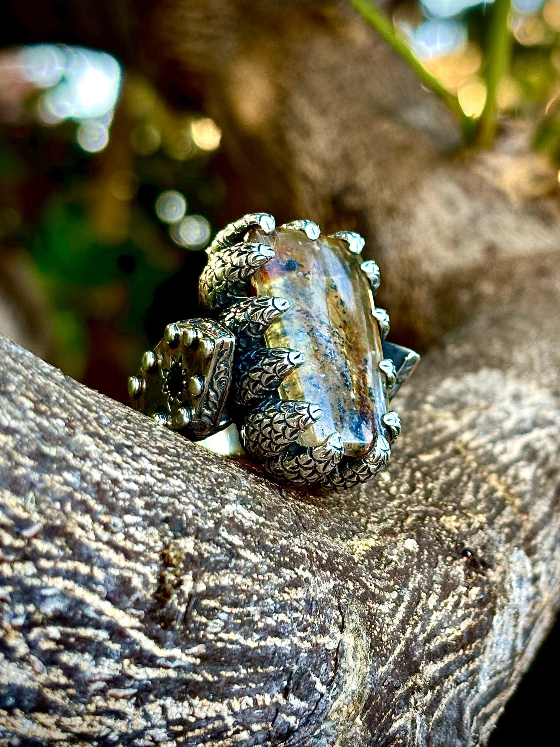 Shop › Dragon Lady Magic size 8 Image 1 of 3 Image 2 of 3 Image 3 of 3 Dragon Lady Magic size 8 $620.00 Unbelievable dendrite set in dragon claw. Made with love in sterling silver. Quantity: Add To Cart Added! Unbelievable dendrite set in dragon claw. Made with love in sterling silver.